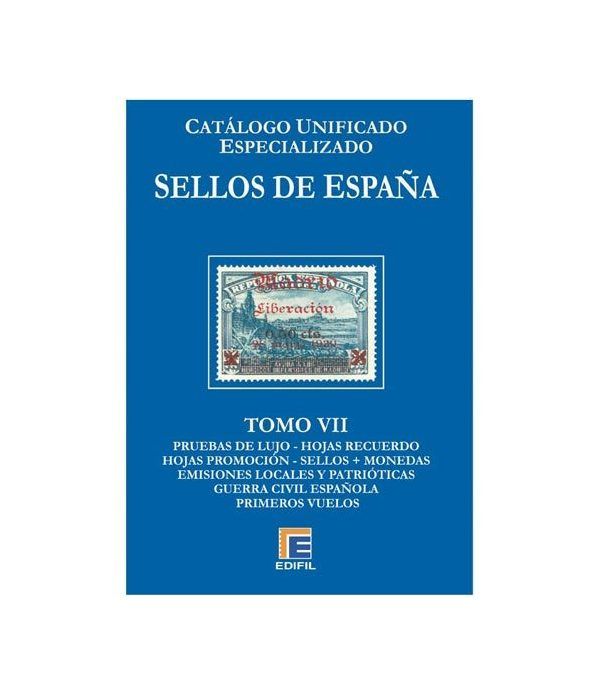 Catálogo Unificado Especializado de Sellos de España Serie Azul. Tomo VII. Comprende las emisiones de Pruebas Oficiales, Hojas Recuerdo, Emisiones locales, Guerra Civil, Primeros Vuelos, etc., incluyendo como novedad la catalogación de las Hojas promoción y un apartado de Pruebas para obsequios. Edición totalmente revisada.