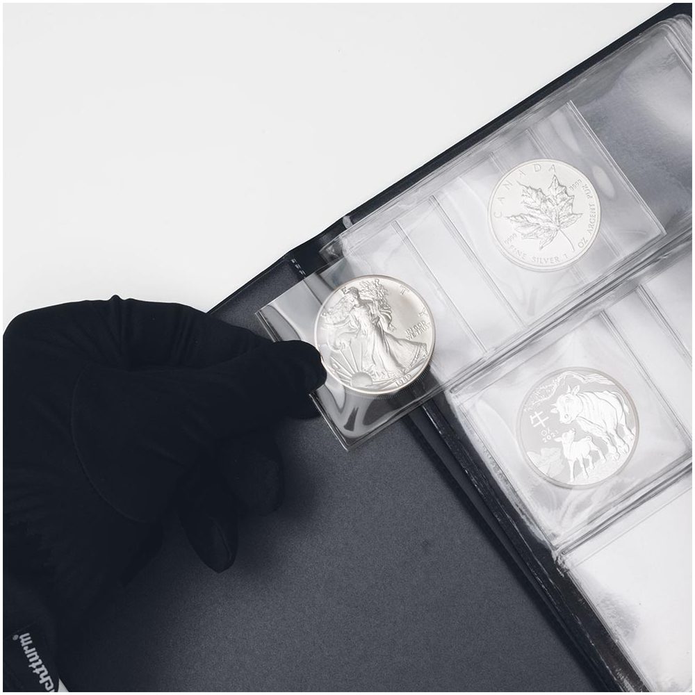 Leuchtturm ha diseñado un álbum de bolsillo especial para las llamadas monedas bullion, que, siguiendo el modelo de los álbumes más populares y vendidos, dispone de perforaciones extra grandes para guardar monedas de inversión de plata.