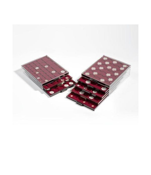 LEUCHTTURM Bandejas MB (236x303) 99 monedas hasta 19 mm. Bandeja rojo oscuro, caja en tono color humo, apilable, se puede combinar, formato exterior: 236 x 303 x 20 mm. Ref. 333127