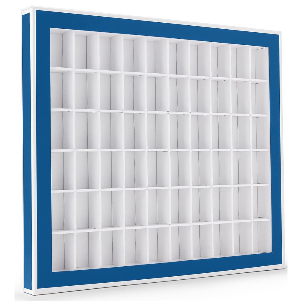 Caja con diseño azul, de un cartón resistente, con paredes divisorias robustas. 60 divisiones de tamaño 50 x 36 x 33 mm.