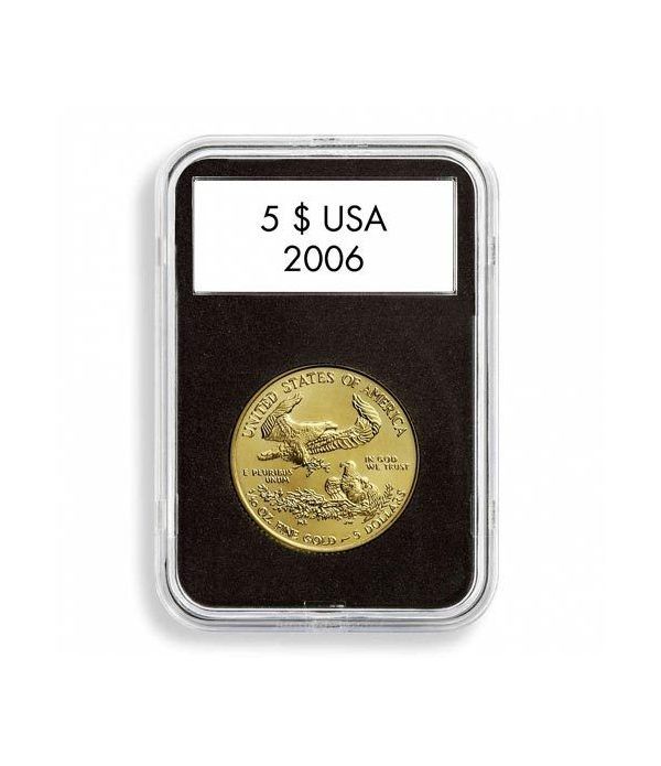 Con cierre seguro. Las cápsulas QUICKSLAB se pueden abrir en cualquier momento. Cápsulas rectangulares que incluyen una plantilla de plástico negra con perforaciones exactas para monedas de 14 a 41 mm de Ø (disponibles en fracciones de milímetros). Con la cápsula QUICKSLAB, su moneda no sólo está protegida de forma duradera, sino que usted podrá incluir en cada cápsula la información que desee, como grados de conservación o año de emisión. Para ello, incluye una ventana y pequeñas tarjetas para inscripciones. Cápsula de plástico de alta calidad, resistente a las ralladuras. Formato exterior: 85 x 59 x 10 mm. Sin plastificantes ni ácidos. Paquete de 5 unidades. Ref. 346414