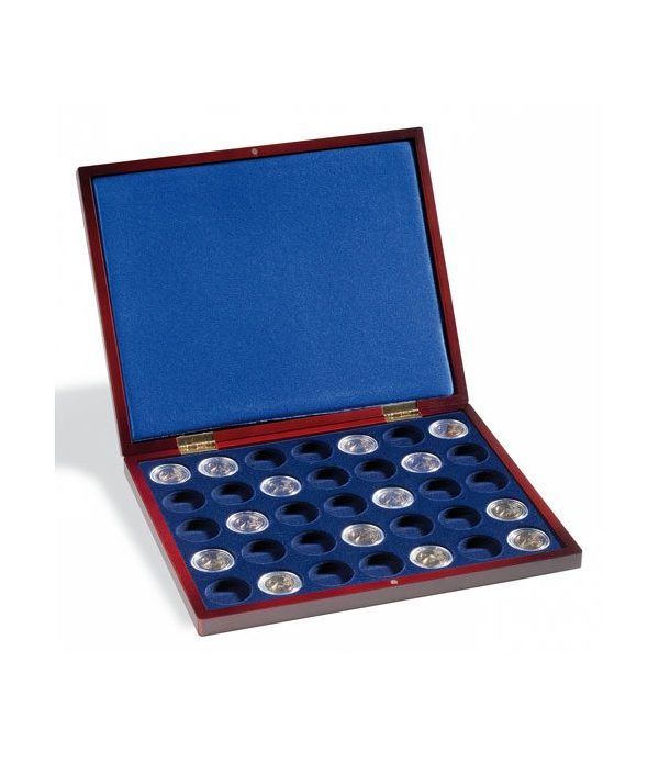 Estuche para monedas VOLTERRA UNO de Luxe de color caoba. Bandeja aterciopelada. Para monedas de 2 euros en cápsulas (Ø 26 mm) y monedas de oro de 100 euro en cápsulas originales CAPS27. Además apta para chapas de cerveza no usadas. 35 divisiones redondas (Ø 33,5 mm). No incluye las capsulas. Medida exterior: 305 x 245 x 30 mm. Ref. 322330
