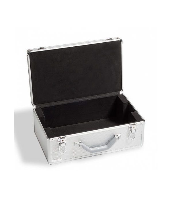 Maletin aluminio TAB (405x240x130) para 12 bandejas terciopelo azul. Este maletín de aluminio puede dar cabida a 12 bandejas TAB para monedas. Interior forrado en terciopelo azul oscuro. Doble cerradura. Resistente asa ABS de material plástico, soportes de goma, esquinas reforzadas. La tapa acolchada evita el deslizamiento de las bandejas. De fácil manejo. Ref. 322142