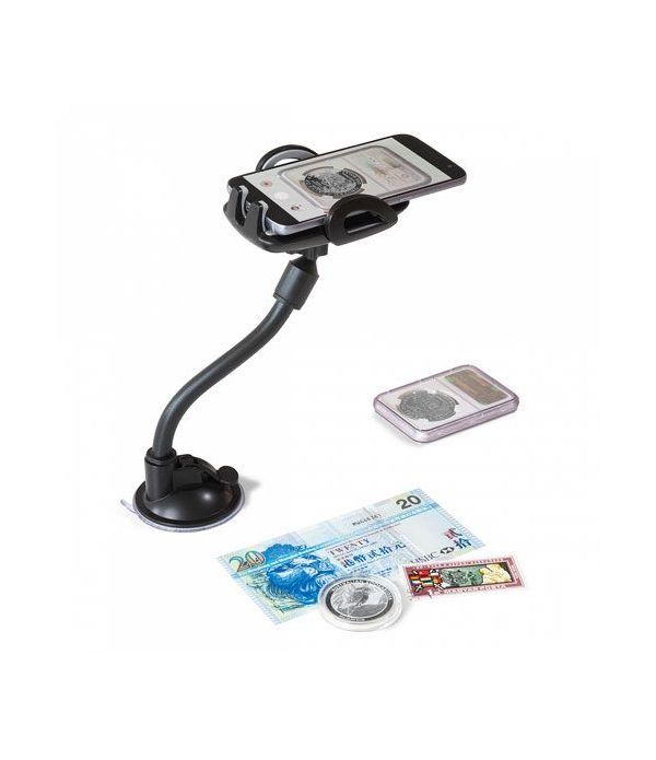 Estable soporte para móviles y smartphones. Con una gran base de apoyo redonda con ventosa (diámetro: 69 mm) que proporciona una gran estabilidad. Reduce el temblor de la cámara. Gracias al brazo flexible y giratorio (longitud: 200 mm), se puede elegir libremente la distancia al objeto. De esta forma, se pueden tomar imágenes con gran detalle e imágenes más generales, por ejemplo, de cápsulas Slab. Con la articulación esférica, en la que se apoya la sujeción para el móvil, se puede además cambiar el ángulo de toma de fotografías. La sujeción para el móvil se puede inclinar aprox. 45° verticalmente y girar aprox. 360° horizontalmente, además se puede ajustar en anchura de forma continua y tiene una superficie antideslizante. Apto para teléfonos móviles y smartphones con una anchura de 50 mm a 95 mm. Medidas de la sujeción (cerrada): 110 x 70 mm. Peso total: 145 g. Ref.360777